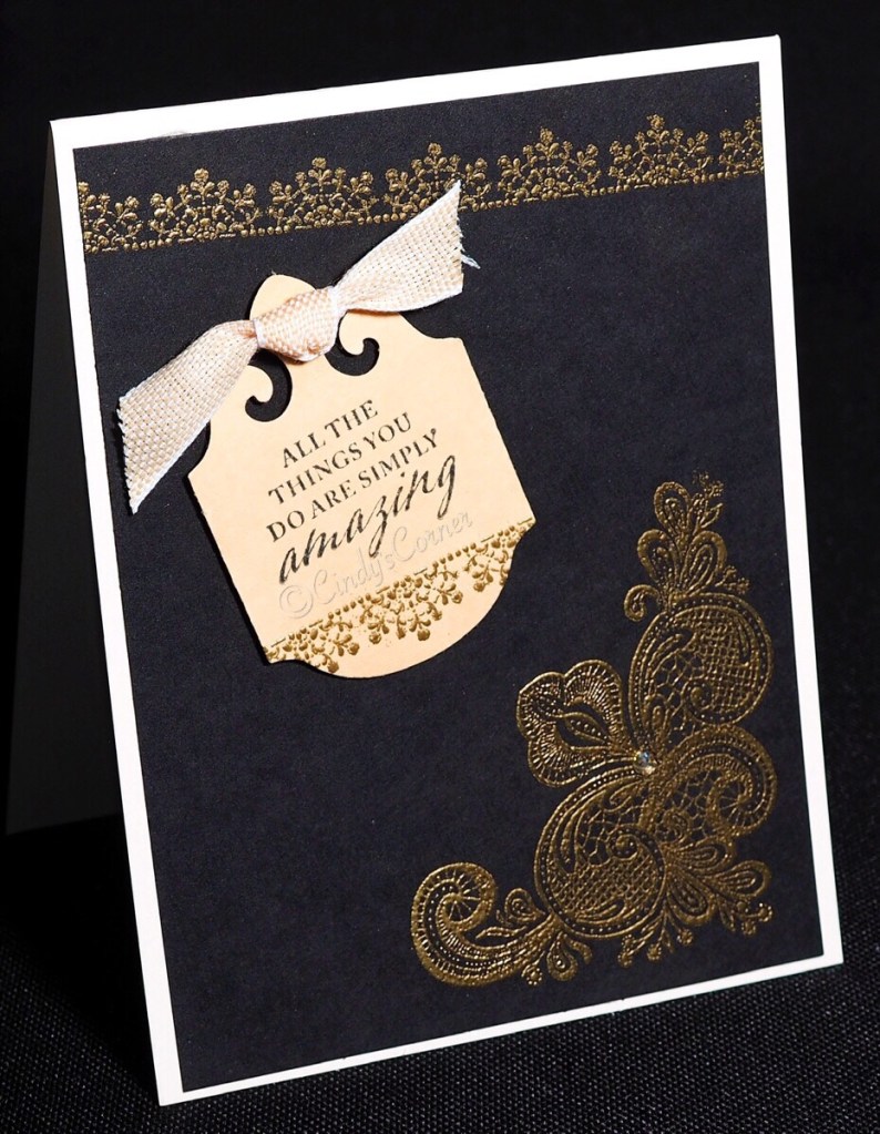 The Elegantly Said Stamp Set is just that ——— I just love the beautiful lace type images and it was perfect for using the Heat Embossing Technique, I chose to use gold on black for maximum impact with a little pop of color using one of the new Pale Papaya card and Pale Papaya and White 1/2 ribbon for my faux knot. If you look really carefully I also used one of the new Genial Gems embellishments in the center or the bottom right-hand lacey piece.