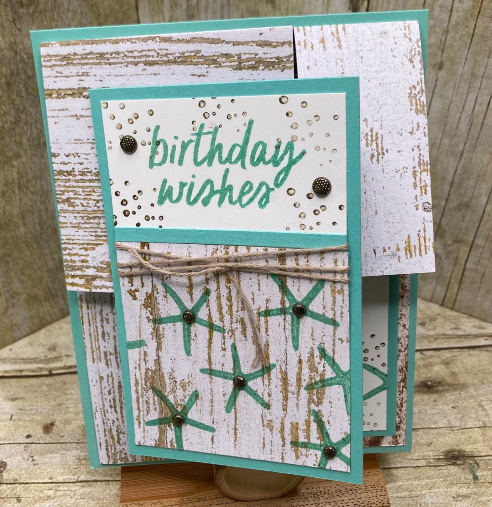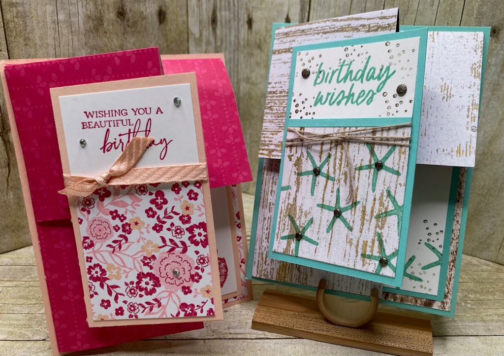 I have no idea what to call this fold other than a Pop UP Corner. It showcases double sided decorative paper perfectly. I enjoyed making the feminine one so much that I also made a more masculine version and made a video while I was at it……….. enjoy 🙂