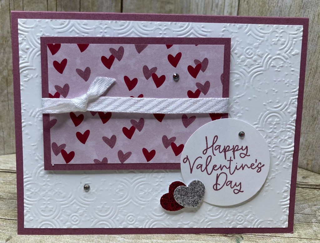 The greeting is from the Hearts of Elegance stamp set from Stampin’ UP! cut with a 1 3/4 circle punch. I dug out a cute little heart punch from my stash along with some Glimmer Paper scraps for my heart decorations.