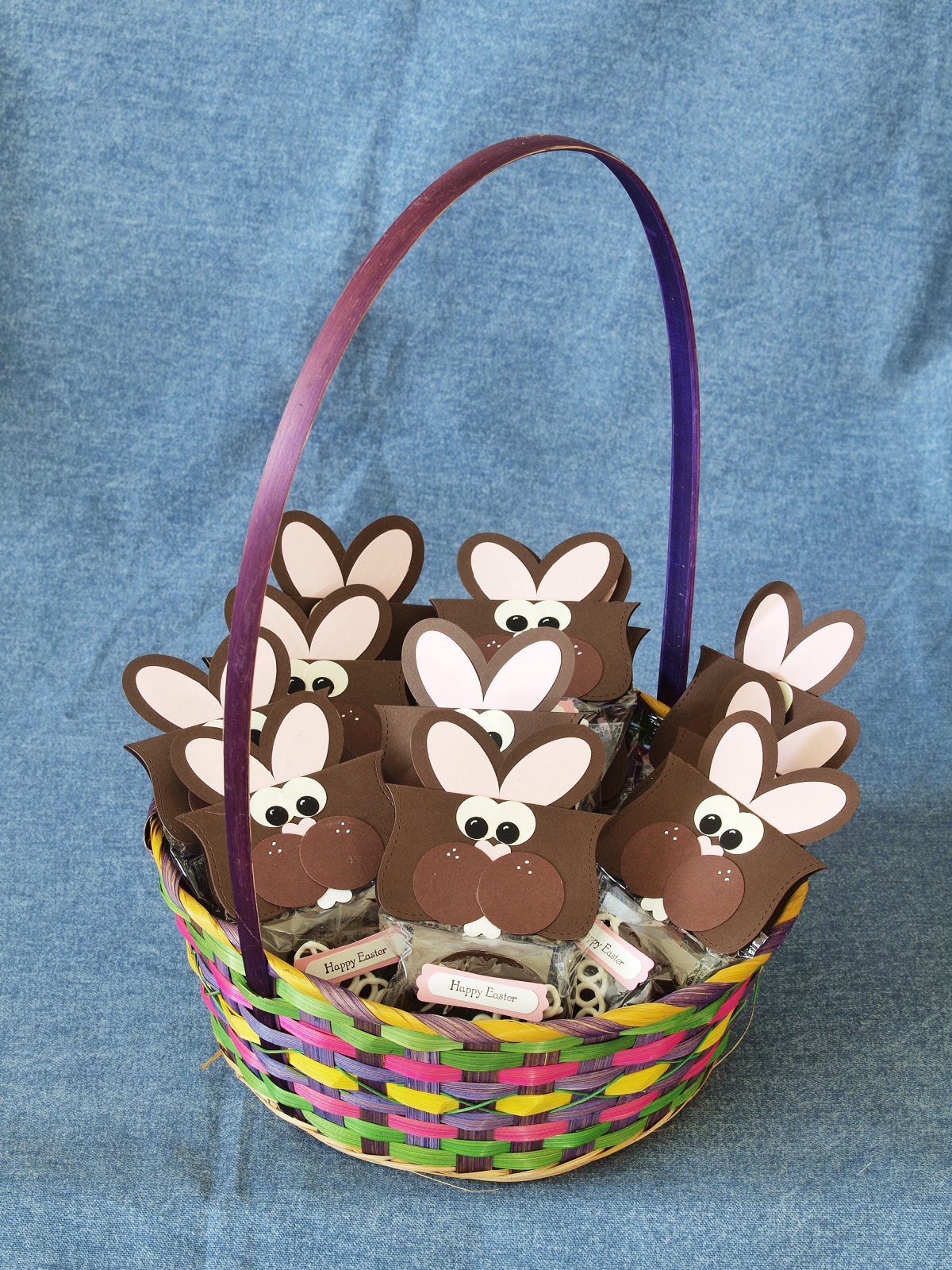 Each of the Whisper White pieces were sponged in Blushing Bride ink, the ‘whiskers’ were little dots using a Smoky Slate Marker. The bunny ‘muzzle’ was assembled using snail adhesive then a Stampin Dimensional used to attach it to the base of the 1 3/4 circle. The ears attached to the back of the head with snail adhesive again.The little ‘glint’ in his eyes were made using a White Gel Pen.