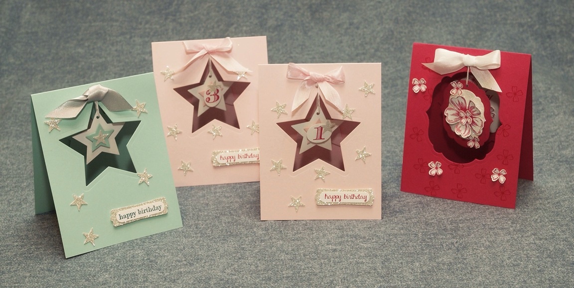 The ‘star’ cards were made using Stampin’ Up!’s Star Framelits and the Something to Say stamp set, I also used Memorable Moments stamp set to put the little numbers onto the dangling stars for the babies.