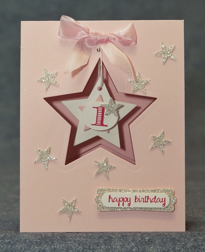 September and October are busy months for birthdays in my family, a Sister-in-law and a Great Niece in September and a Granddaughter in October. I saw a design for a card with a ‘dangly’ star and plenty of bling made by Connie Stewart which would be perfect for the ‘littlies’, then I worked thru a version for my Sister-in-Law………. here are the results.
