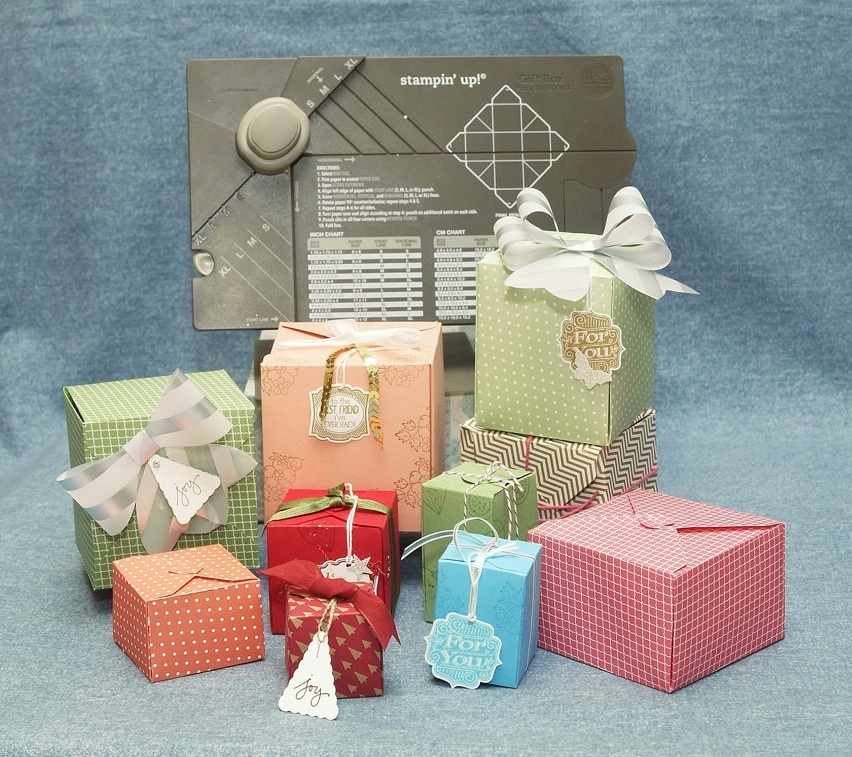The largest box is 4 x 4 x 4 and uses 12 x 12 card stock. The smallest is 1 3/4 x 1 3/4 x 1 3/4 and starts with 6 x 6 card stock. These boxes are just perfect for holiday treats, candy, cookies. The largest box would hold a medium-sized candle the smallest? ………perhaps a piece of jewellery.