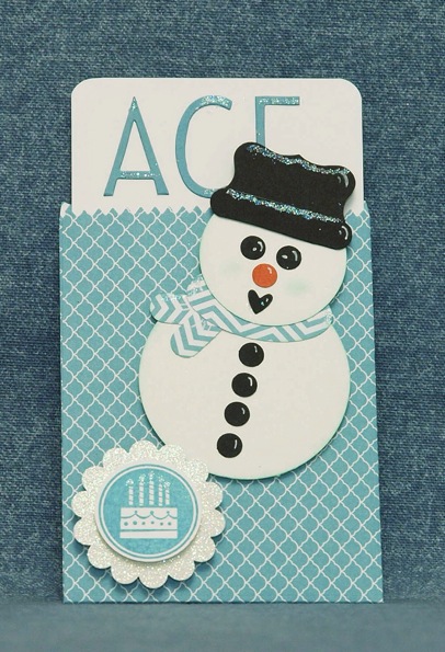 The snowman was inspired by Traci Cornelius, and uses the 2 1/2 inch circle for the body and 1 3/4 circle for his head. The eyes, nose and buttons were punched using the small eyes from the Owl Builder punch. The hat used the Curly Label and Word Window punch, some 2 way glue pen and a sprinkling of Dazzling Diamonds glitter completed the little guy.