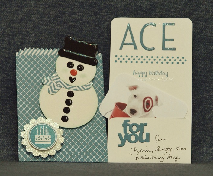 Rather than simply give the gift-card in the little holder they give you at the store I made a birthday card/holder using the new Mini Treat Bag Thinlit from the new Stampin’ Up! Occasions mini catalog*…………….