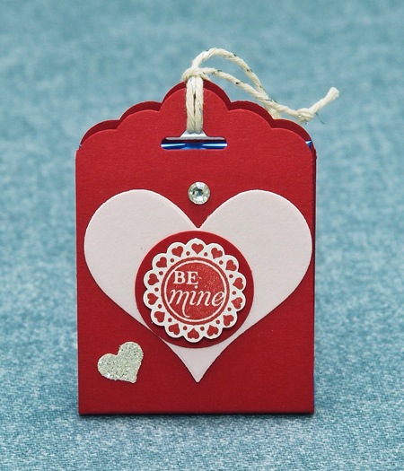 The ‘Be Mine’ is stamped on Whisper White, punched with the 7/8 scalloped circle. This is then layered onto 1″ circle in Real Red with a Stampin’ Dimensional, then attach this to the Sweetheart punched from Pink Pirouette with Snail adhesive.