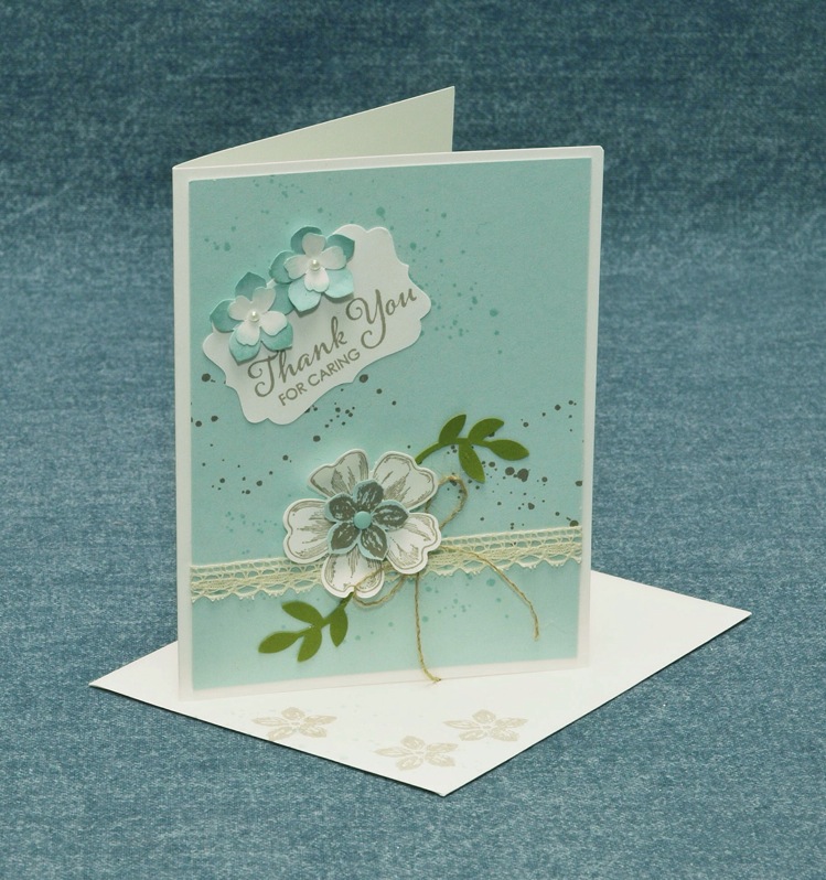 The larger flower was stamped onto Whisper White card in Sahara Sand ink and the smaller flower (from the Petite Petals Stamp Set) stamped onto Soft Sky card with Sahara Sand ink. Each was punched out with the matching punch. (Great to have punches that match stamps – it makes it so much quicker to build a beautiful card!) These were layered together with a glue dot. Garden Green card was used to cut out the leaves from the Bird Builder punch, these and the flowers were attached just above the lace trim with a Stampin’ dimensional.