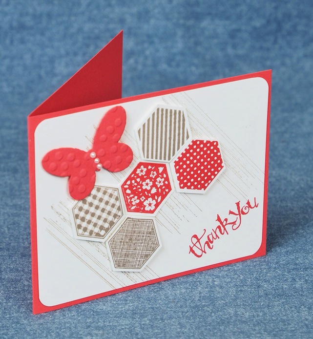 Each of the hexagons were stamped on whisper white card then cut using the Hexagon Punch then attached to base card with Stampin’ Dimensionals.