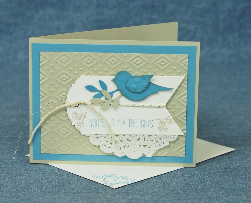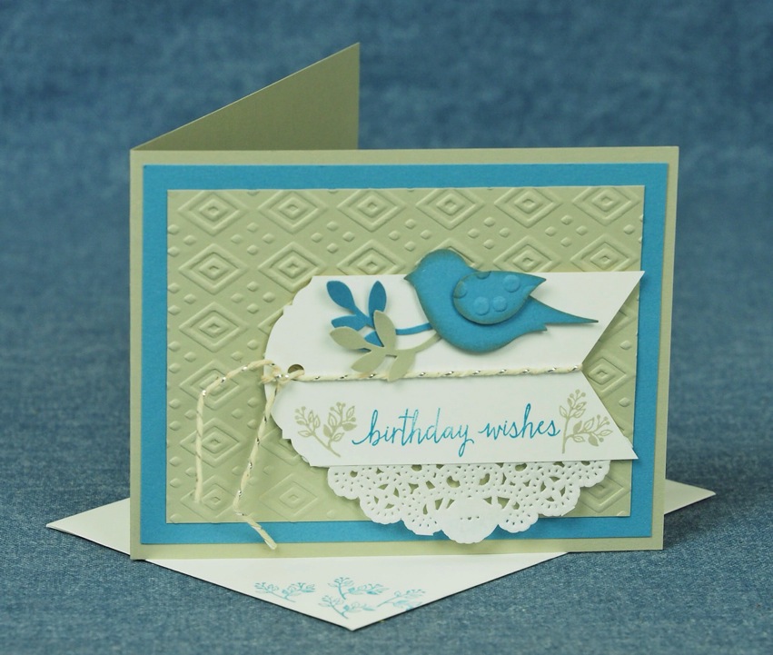 Half a Tea Lace Paper Doily attached underneath with a little Snail adhesive. The bird was made using the Bird Builder Punch and Marina Mist card then sponged with Sahara Sand ink, this punch also includes the little stem of leaves as well.