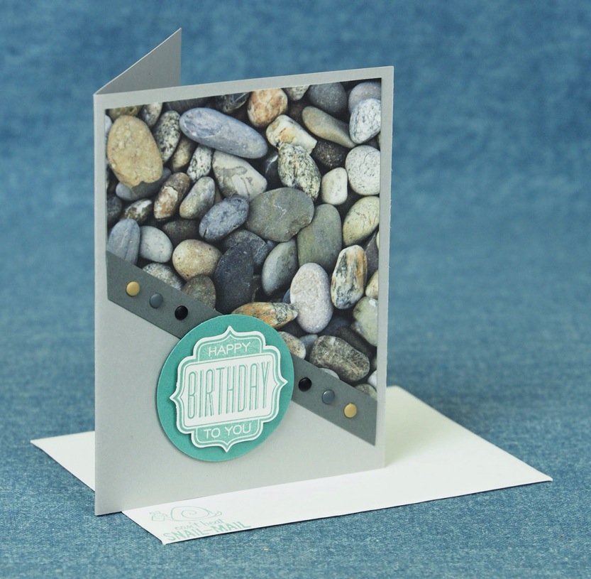 Designer Series Paper : 4 x 5 ~ cut at an angle so one of the long sides measures 5″ and the 2 1/2″ (this pebble paper is from a paper stack that retired back in June but it makes such a perfect guy card I could not resist using it)