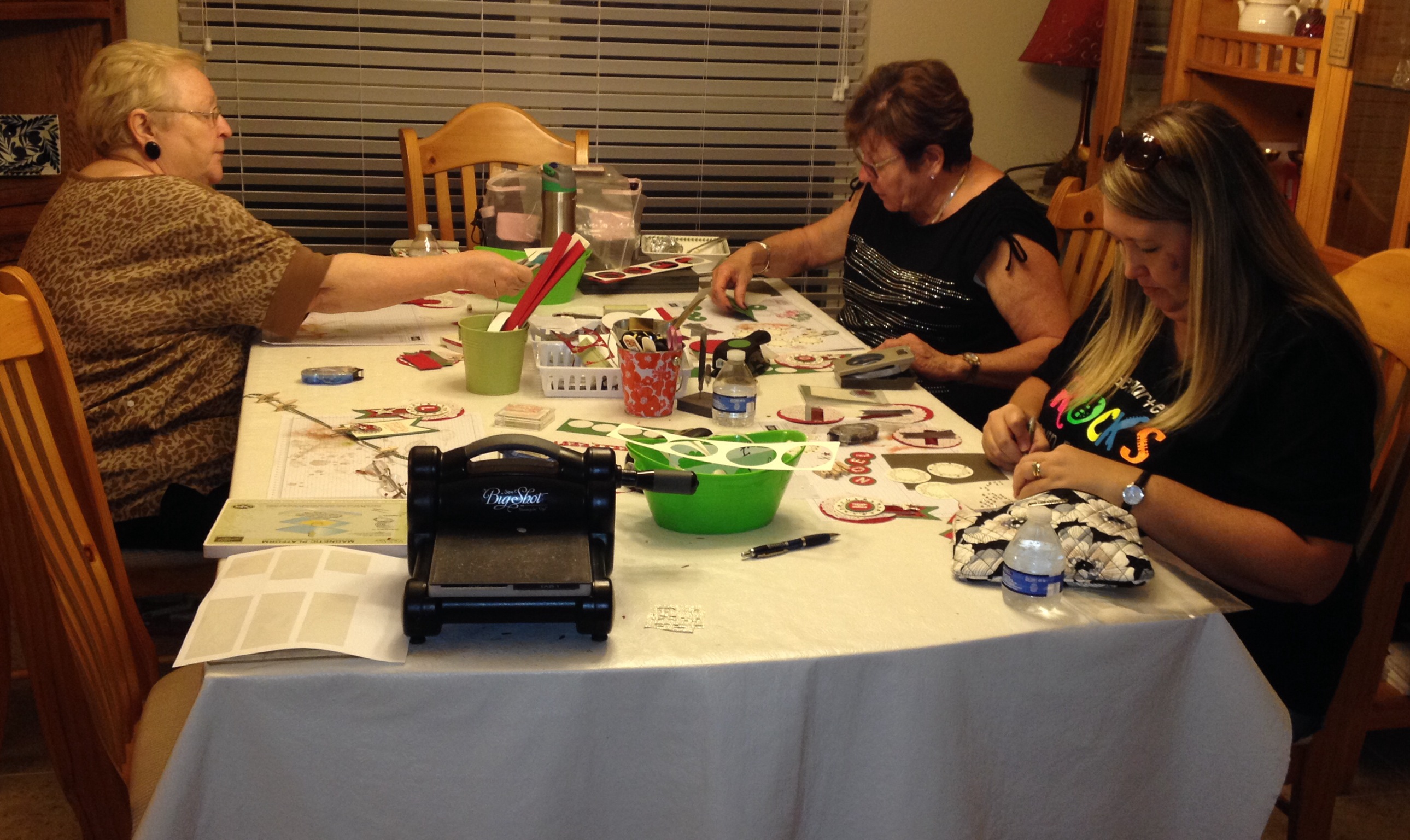 Here is my team of helpers – we did a dress rehearsal a couple of days before hand just to make sure all the pieces were correct, stamps, punches, ink pads etc were all available! Sincere thanks to Jen, Joanne and Margaret for giving up your whole evening and then to help on the day!