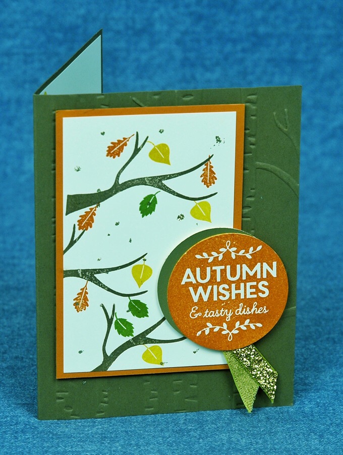 I embossed the front of the card with the Woodland Textured embossing folder, before attaching the Pumpkin Pie/Very Vanilla layers with Stampin Dimensionals. The ‘Autumn Wishes’ was cut using the 2″ circle punch then a layer of the gold foil offset behind. The ribbon was attached with a couple of glue dots.