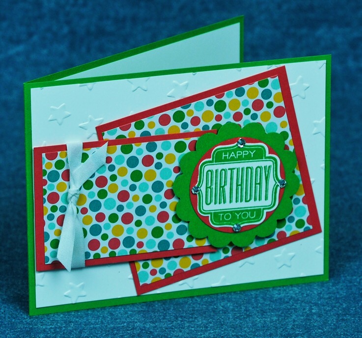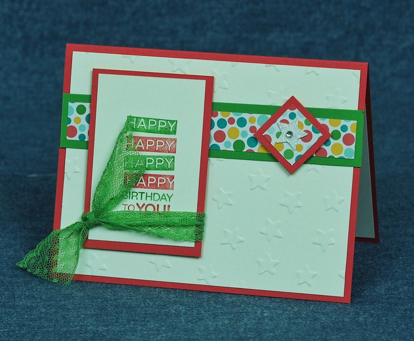 Again this greeting is from the ‘Amazing Birthday’ stamp set, for this one I used Stampin Markers to give me the alternating colors. Again I pulled in some Cucumber Crush 1″ Dotted Lace Trim and a mini star punched from Dazzling Diamonds Glimmer paper. I just love this glimmer paper ~ it gives a lovely subtle sparkle to everything.