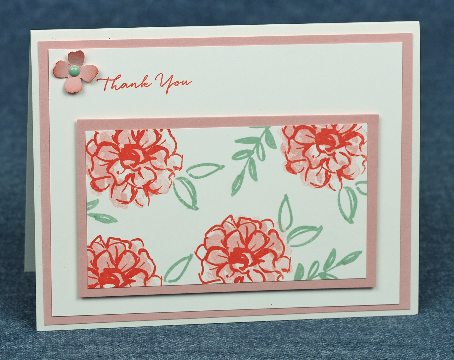 I used the first stamp with Blushing Bride stamped off on a sheet of scrap paper before putting it on my card. The second stamp with full strength Blushing Bride then the 3rd stamp with Calypso Coral ink. Because the stamps are photopolymer it is so easy to line them up! The little leaves were added in Mint Macaron ink.