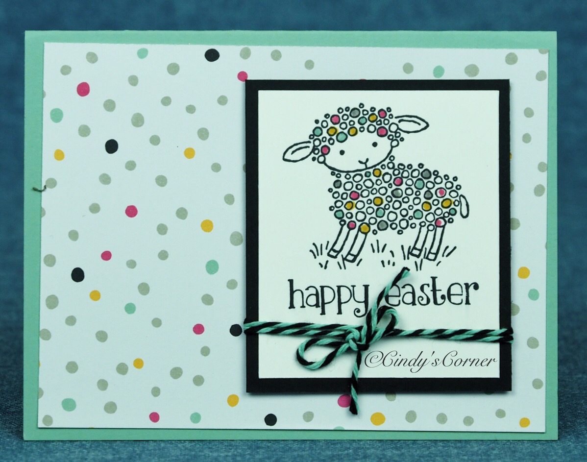 This is a perfect card to celebrate Easter – light and joyful colors and the cutest little spring lamb giving us a cheeky look. This is another card from the Shoe Box swap from last month – I saved sharing it until today…. and it is using more from the DSP stash!!