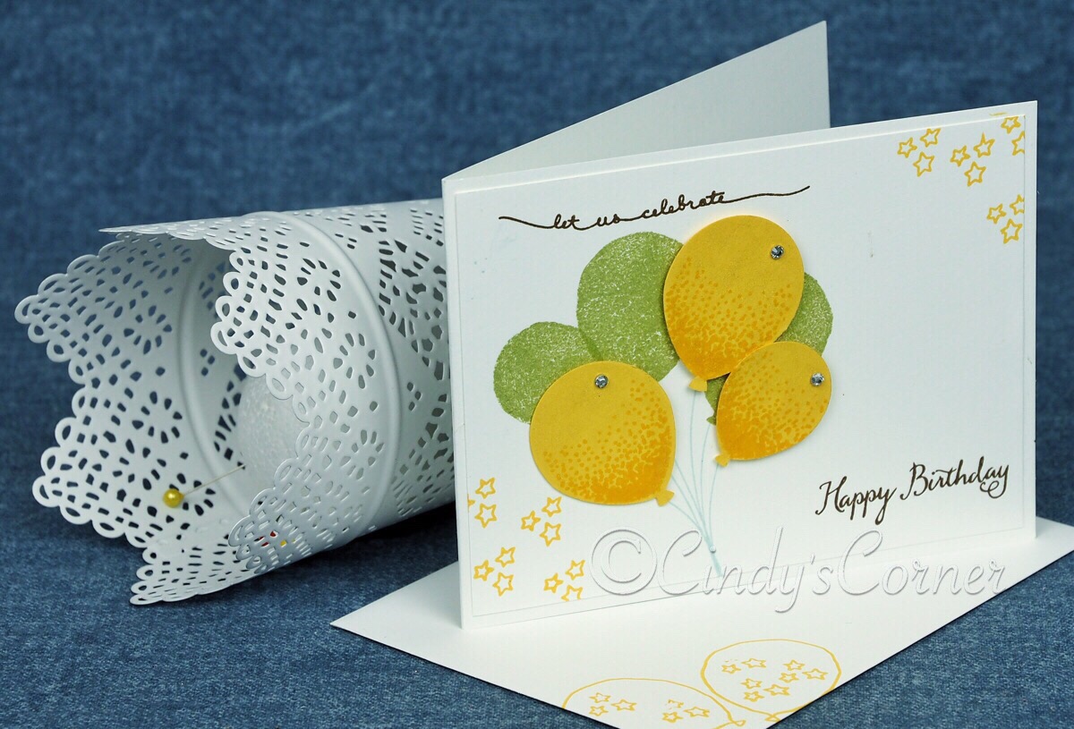 Ink Colors: Daffodil Delight, Pear Pizzazz, Chocolate Chip and Sift Sky for the balloon strings, then attached to card with stampin dimensionals.