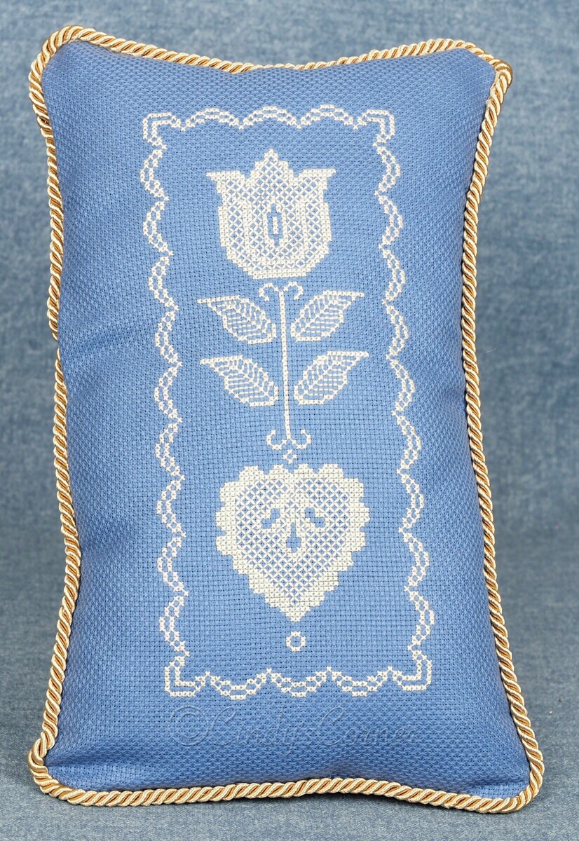 She had started a cross stitch piece in her favorite blue and cream, but was unable to complete it, it sat in a box until I found it last year and asked if I could finish it for her. I bought it back to the US where I now live and finished the stitching. Not sure what to do with it next it sat in my work box for about 6 months until it dawned on me it would make a perfect gift for a milestone birthday.