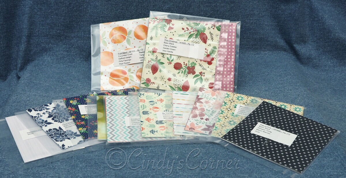 Our papers come in 12×12 sheets and in my share, they are cut down to 6×6″ Each set is carefully placed in a clear bag with the name and catalog number of the product as well as the Stampin’ Cup! colors used to create them – which makes it very easy for matching up when you come to use them. Each person received a total of 96 pieces of paper for the princely sum of $25 (+shipping) To have bought a whole packet of each would have totaled $176.23!!