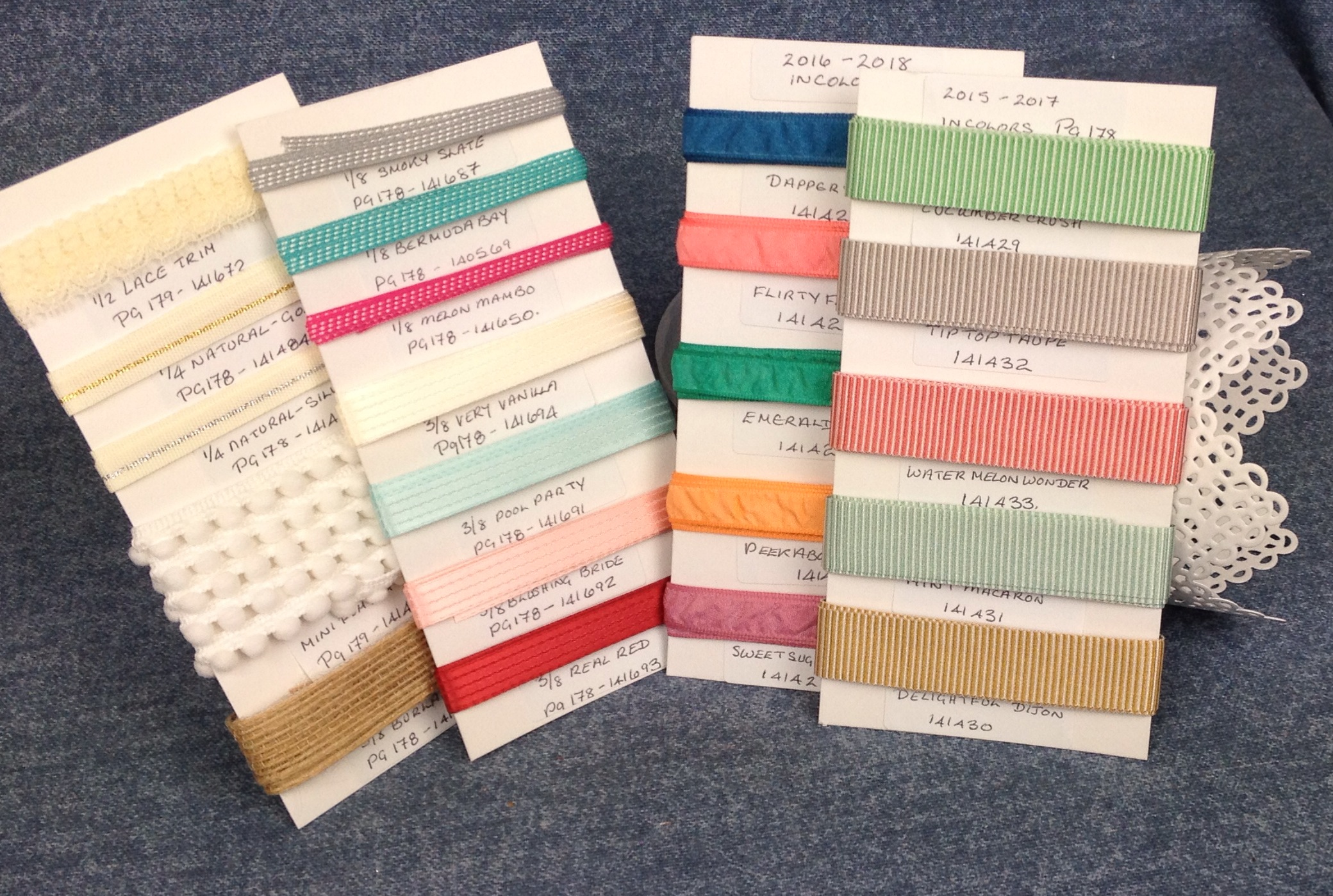 I carefully wind each of the 1 yard ribbon lengths around a piece of card so they stay in perfect condition. Again I have labelled each of the ribbons so they are easy to identify. This year I split the ribbon share into two parts – the two on the left are the ‘In colors’ for 2015 – 2017 and 2016 – 2018. The two on the left are the other new ribbons that were added to the catalog this year. There are a total of 25 yards of ribbon for a total of $22.50 – again a wonderful deal if you are not sure you could use a 5yd or 10yd bolt of ribbon!!