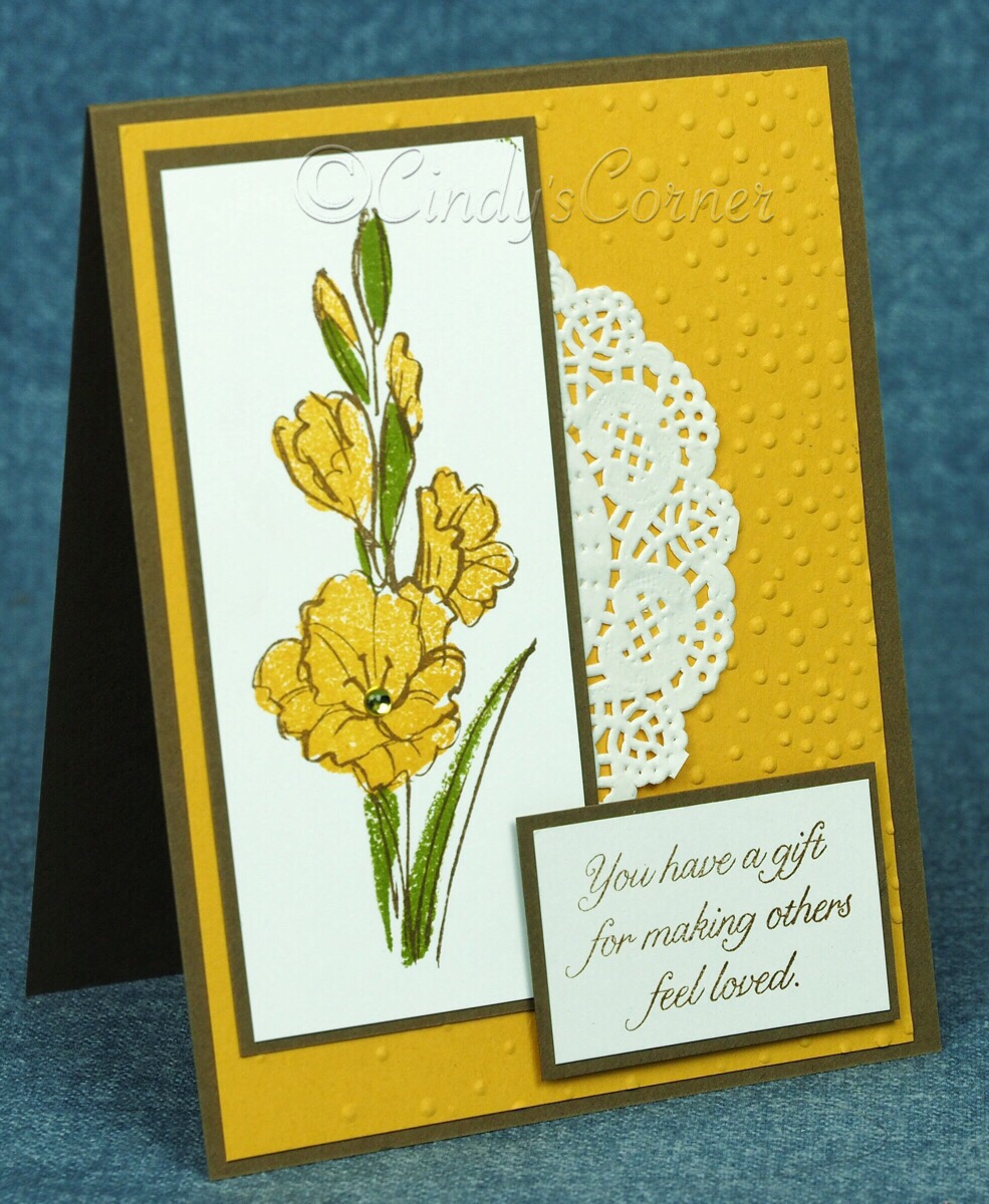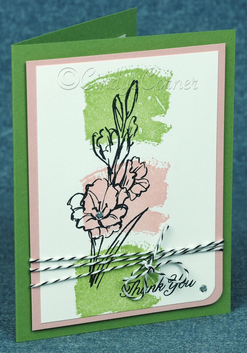 I love the fresh colors in this card (inspired by Judy May) Blushing Bride and Wild Wasabi, which set off the black of the flower beautifully. The big ‘slodge’ stamp comes from the Work of Art Stamp set.