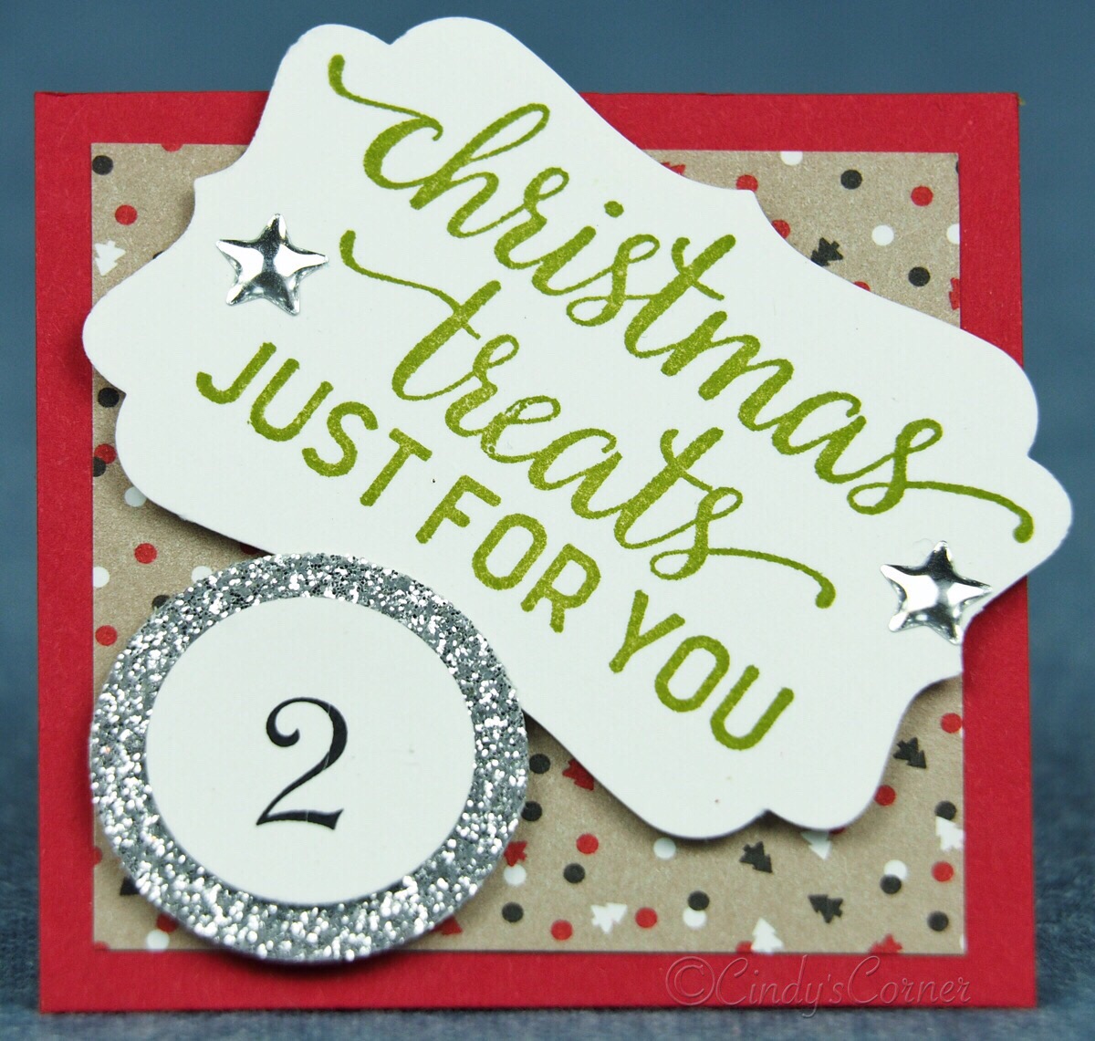 The number for all the squares uses the 3/4 inch circle and the layered glitter paper the 1 inch circle.