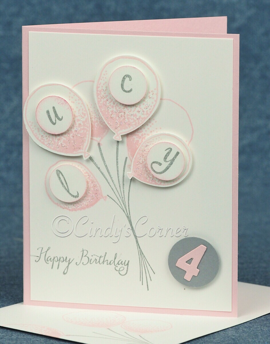 The stamp set is Balloon Celebration and Brushwork Alphabet to spell out her name. Each letter was cut with the 3/4 circle punch then sponged in Pink Pirouette ink before being attached with stampin’ dimensionals.