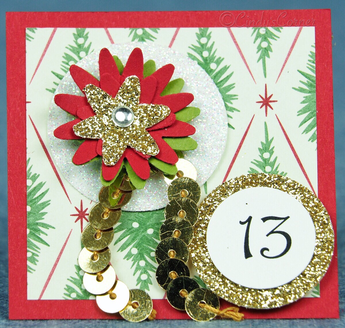 Poinsettia were in my mind on this square, I love doing punch art and the Blossom Bunch punch is perfect for making them. Real Red and Old Olive card were used for the ‘bracts’ and gold glimmer paper for the center ‘flower’ This was all layered onto a 1 1/2″ circle of Dazzling Diamonds Glimmer Paper and a 2 x 2 square of the ‘This Christmas’ specialty DSP.