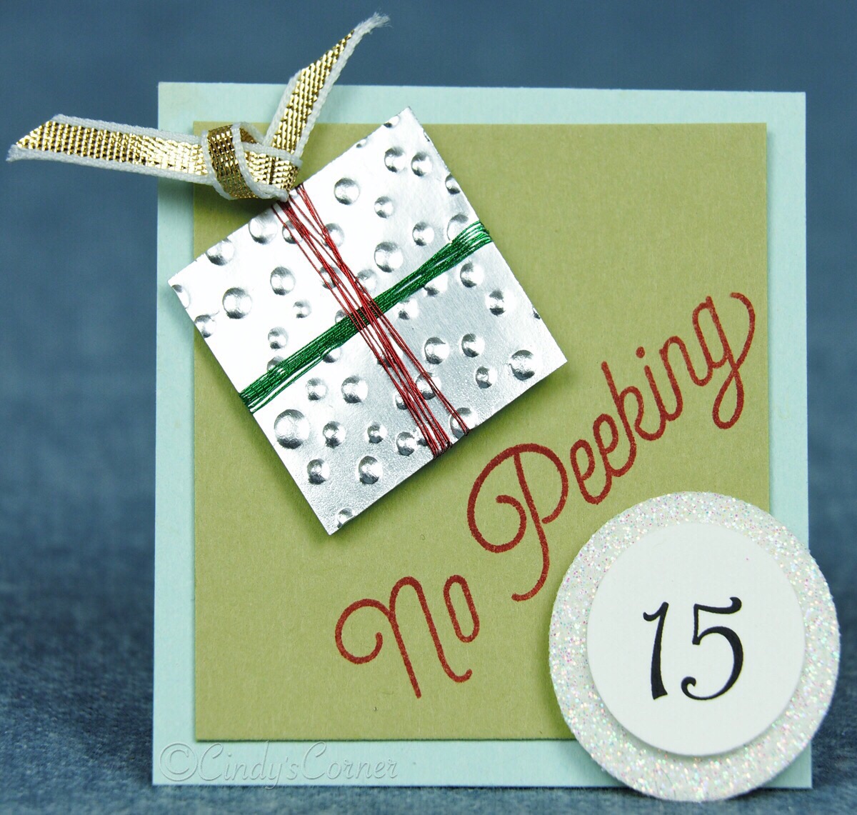 Day 15 brings us a little Christmas gift box. This is a 1″ square of silver foil which was run thru the Big Shot with the Softly Falling Embossing folder. Then wrapped with the Metallic Thread in Red and Green.