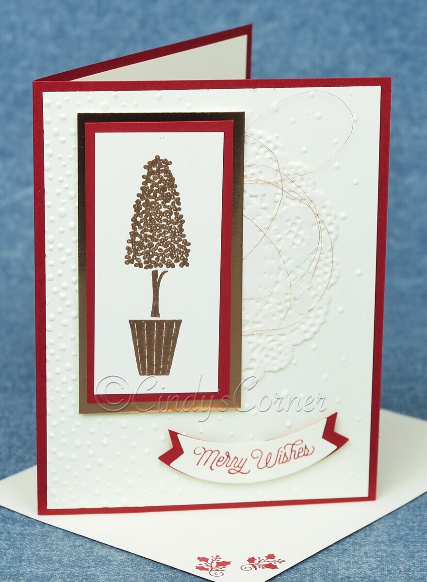 Made with Cherry Cobbler, Very Vanilla and Copper Foil, the tree is heat embossed with copper and Metallic Copper Thread looped over a Delicate White Doily.