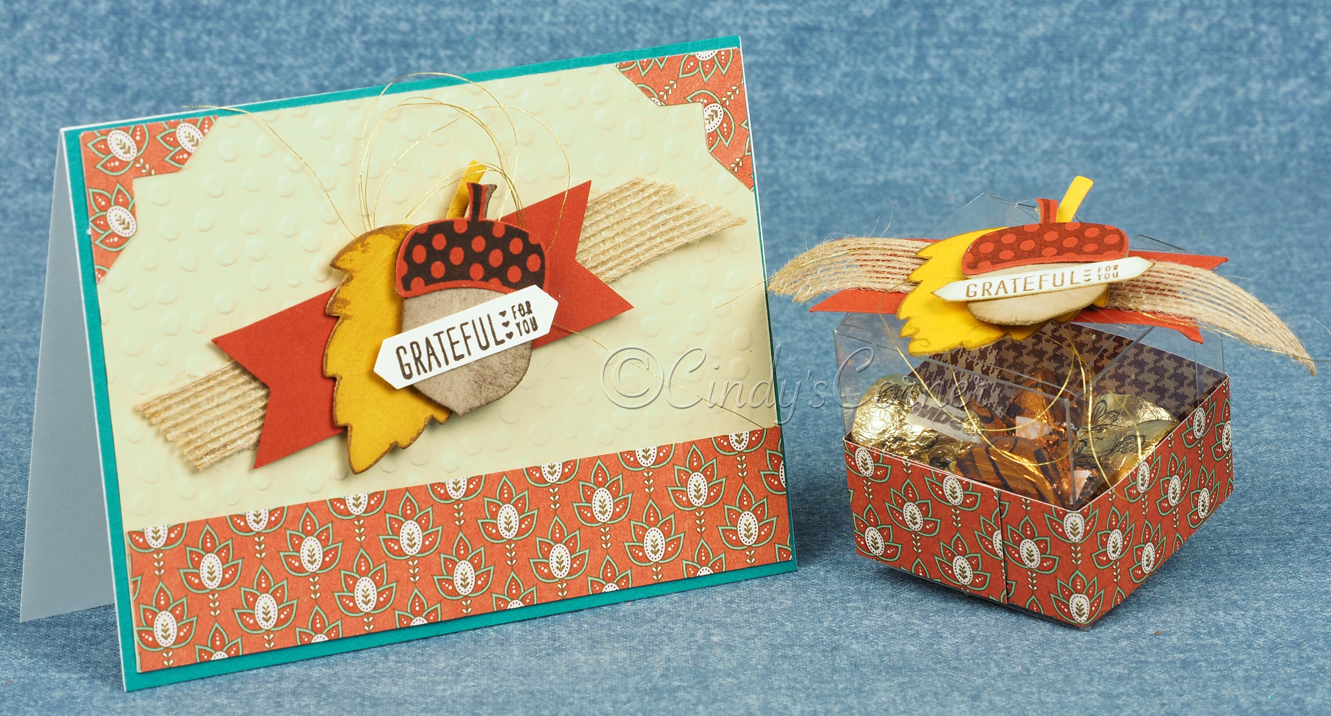 The October class had a thanksgiving theme and we made two cards, both of which I have shared, and then we had a little bonus project which was the treat holder on the right, made using the Clear Tiny Treat boxes from Stampin’ Up! and Petals and Posy’s DSP.