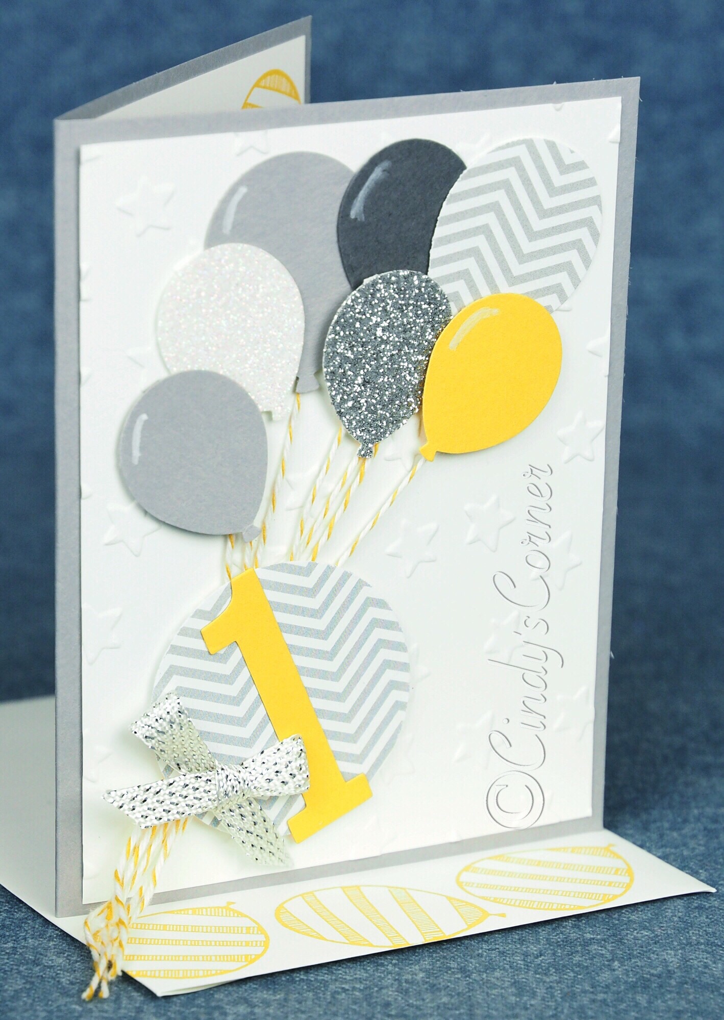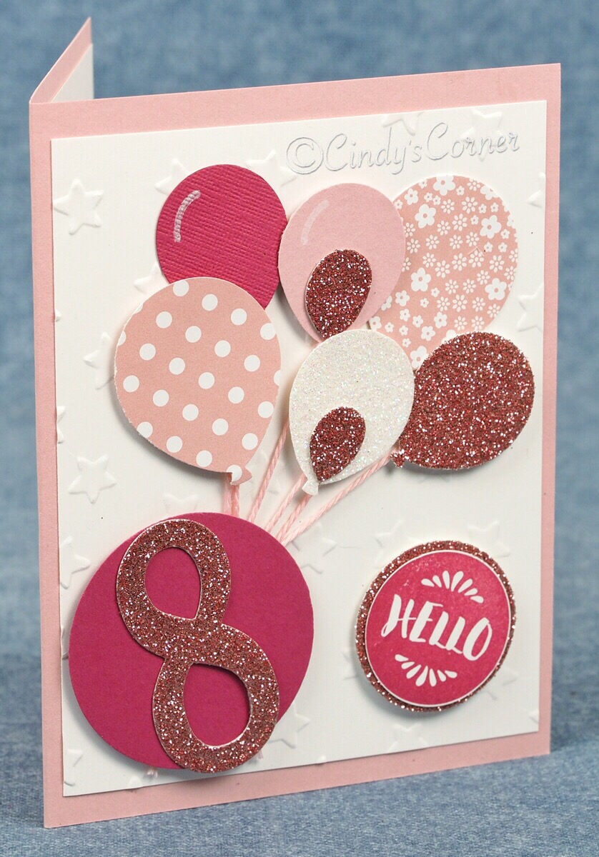 All balloons were cut from card, DSP and glimmer paper using the Balloon Bouquet punch. The White Stampin’ Chalk Marker is just perfect for putting those little hightlights that make the ballon seem a little more real.