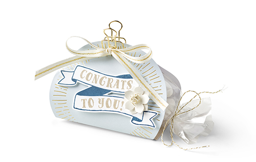 Who wouldn’t love to receive this classy little treat package? We simply stepped up one of the round card bases with a bit of Gold 1/8″ Ribbon, a Gold Binder Clip, and a cellophane bag.