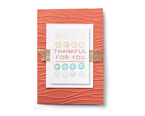 You can also use this kit’s versatile stamp set to create a fabulous card that won’t send you running to the bakery for a donut fix! To get the fun, textured background featured here, just run Calypso Coral Cardstock through the Big Shot using the Seaside Textured Impressions Embossing Folder. And be sure to add a piece of 5/8″ Burlap Ribbon for a trendy, finishing touch!