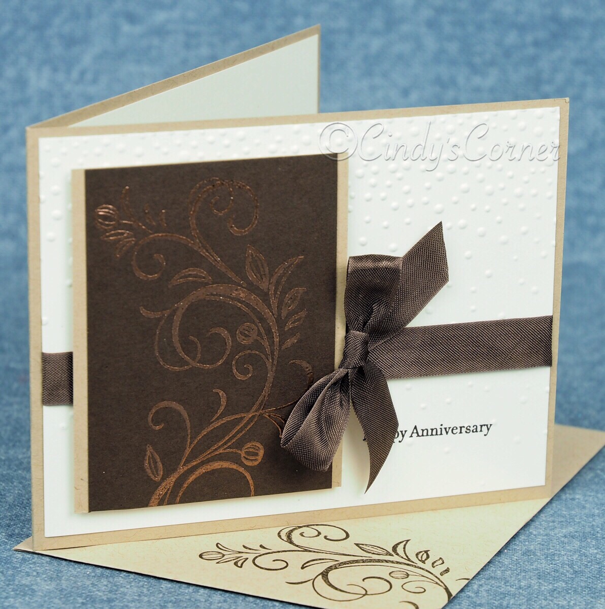 Yesterday was our 16th Wedding Anniversary – it seems incredible ~ those years have flown by so fast.  I made a card for my husband and tried very hard to give it a bit of a masculine twist, I think I captured it in the colors but perhaps the bow was a little too ‘girly’ – but he took it very well.
