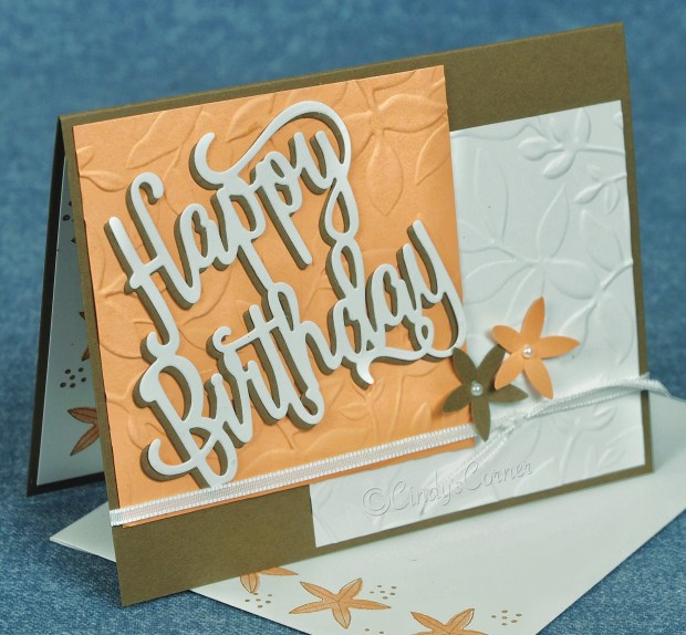 Layer 1: 3 1/2 x 3 1/2 Peekaboo Peach Card run thru the Big Shot with the Layered Leaves Embossing Folder