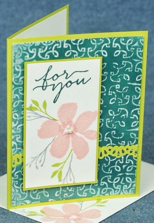 I have a monthly class where we explore different techniques using card and ink with some added stamp sets, ribbons and other embellishments. We then use the technique to create a card and a couple of months ago we did one using ordinary wax paper. To be honest, the only reason I have wax paper at all is to use for my card crafting – I think this is the second technique we have done with it and I have a couple more up my sleeve!