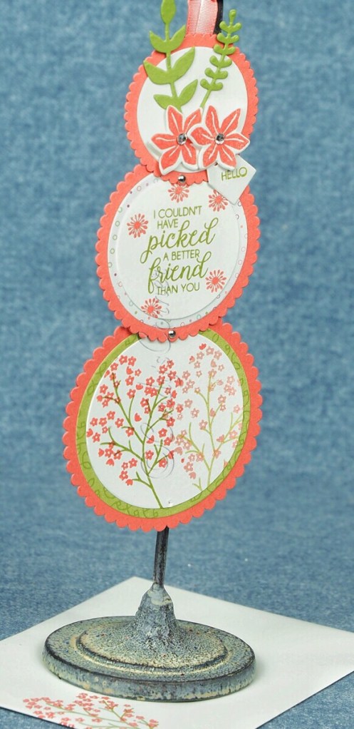 Each of the scalloped circles were cut from Calypso Coral card and to give more texture I cut layering circles from the Petal Garden DSP Stack for the middle and bottom pieces, then Whisper White card for the top layers.