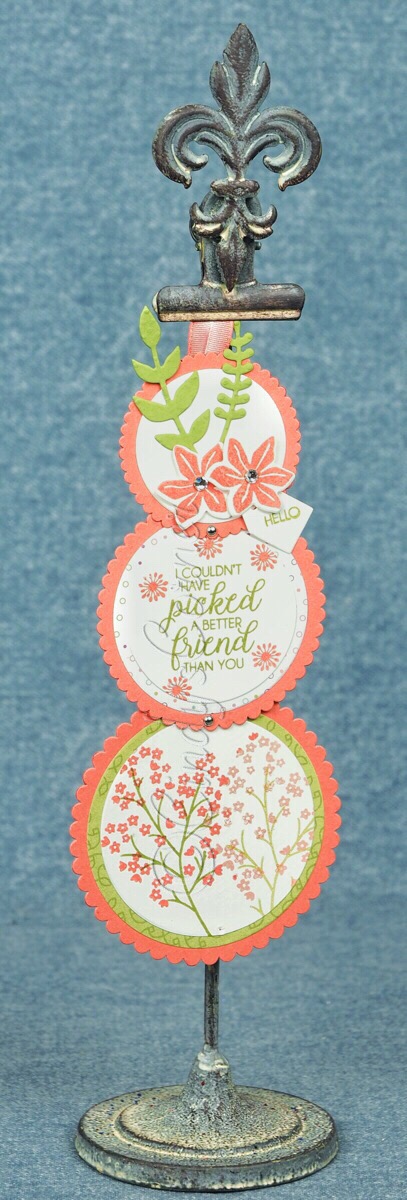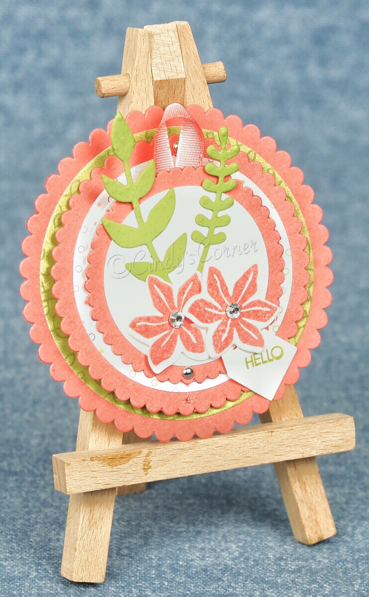 Each of the scalloped circles were cut from Calypso Coral card and to give more texture I cut layering circles from the Petal Garden DSP Stack for the middle and bottom pieces, then Whisper White card for the top layers.