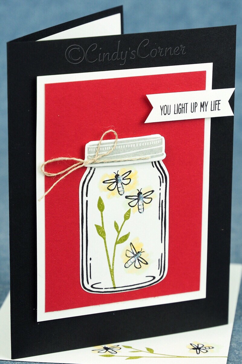 The jar was stamped on Whisper White card with Basic Black ink, then the leafy stem added and thirdly the fireflies . I used the Everyday Jars framelits to cut the jar and the little lid after I stamped it in Smoky Slate ink.