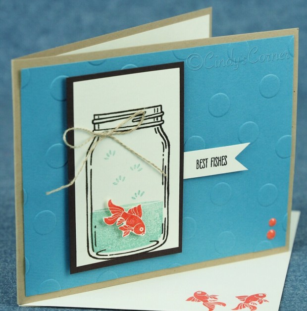 All the images and greeting is from the Jar of Love stamp set, it is very versatile, I fussy cut the little fish and attached him to the card with a mini Stampin’ Dimensional. I pulled the Calypso Coral thru the card using a couple of Enamel Dots then a couple of fish on the envelope.