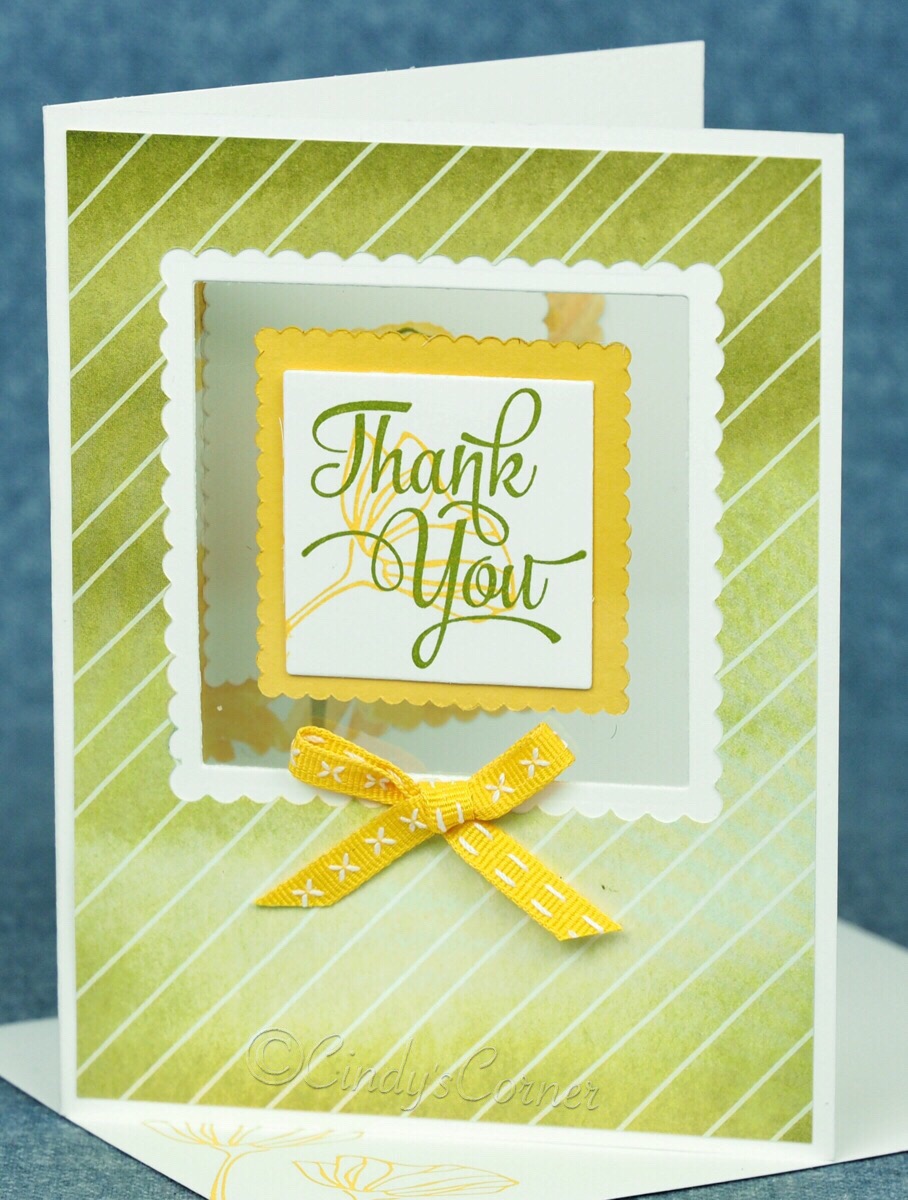 The window sheet (acetate) was attached to the inside of the front of the card with 4 mini glue dots, Thank you was attached to the outside of the window sheet with a couple of glue dots then the daffodil delight/pool party square lined up and centered and attached to the inside of the window sheet, so that none of the glue dots show.
