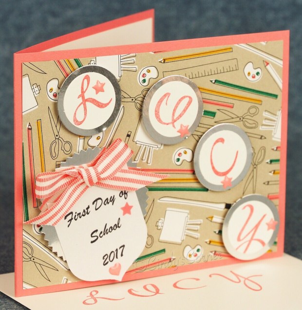 I used the Brushwork Alphabet stamp set to spell out the name, punched with the 1″ circle punch then layered onto 1 1/4 circle from the Silver Foil Card.