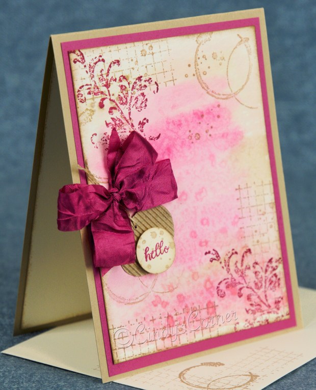 Each month I have a technique class, where we explore the various things that can be done with ink and paper to produce a beautiful card. This month we played with ink refills and Sea Salts to create a background that only needed a little stamping and a bow and the card was done.