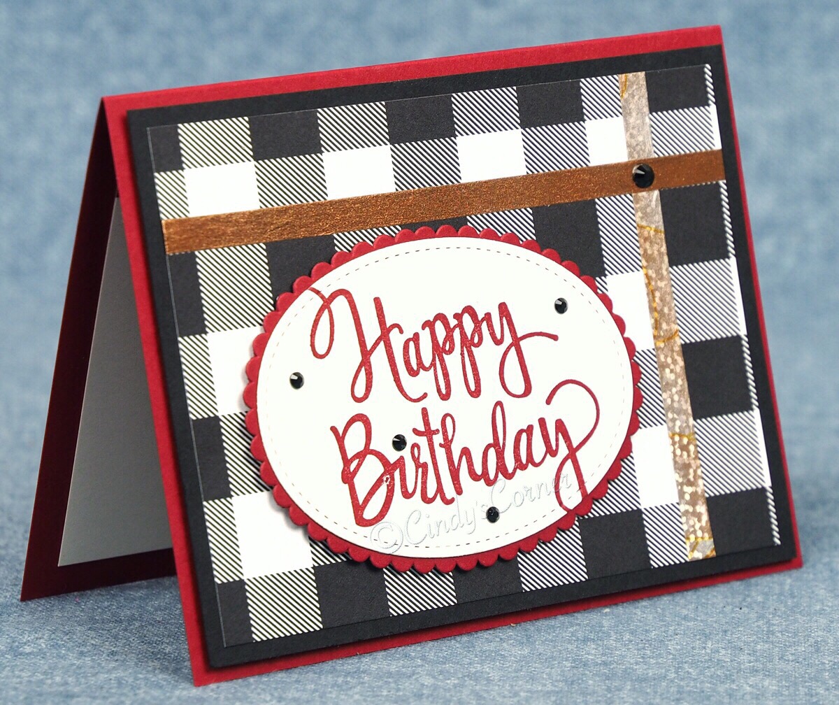 A simple ‘Happy Birthday’ was really all that was needed cut with the Stitched Shaped Framelits and a scattering of the Black Rhinestone Jewels from page 53 of the Holiday catalog.