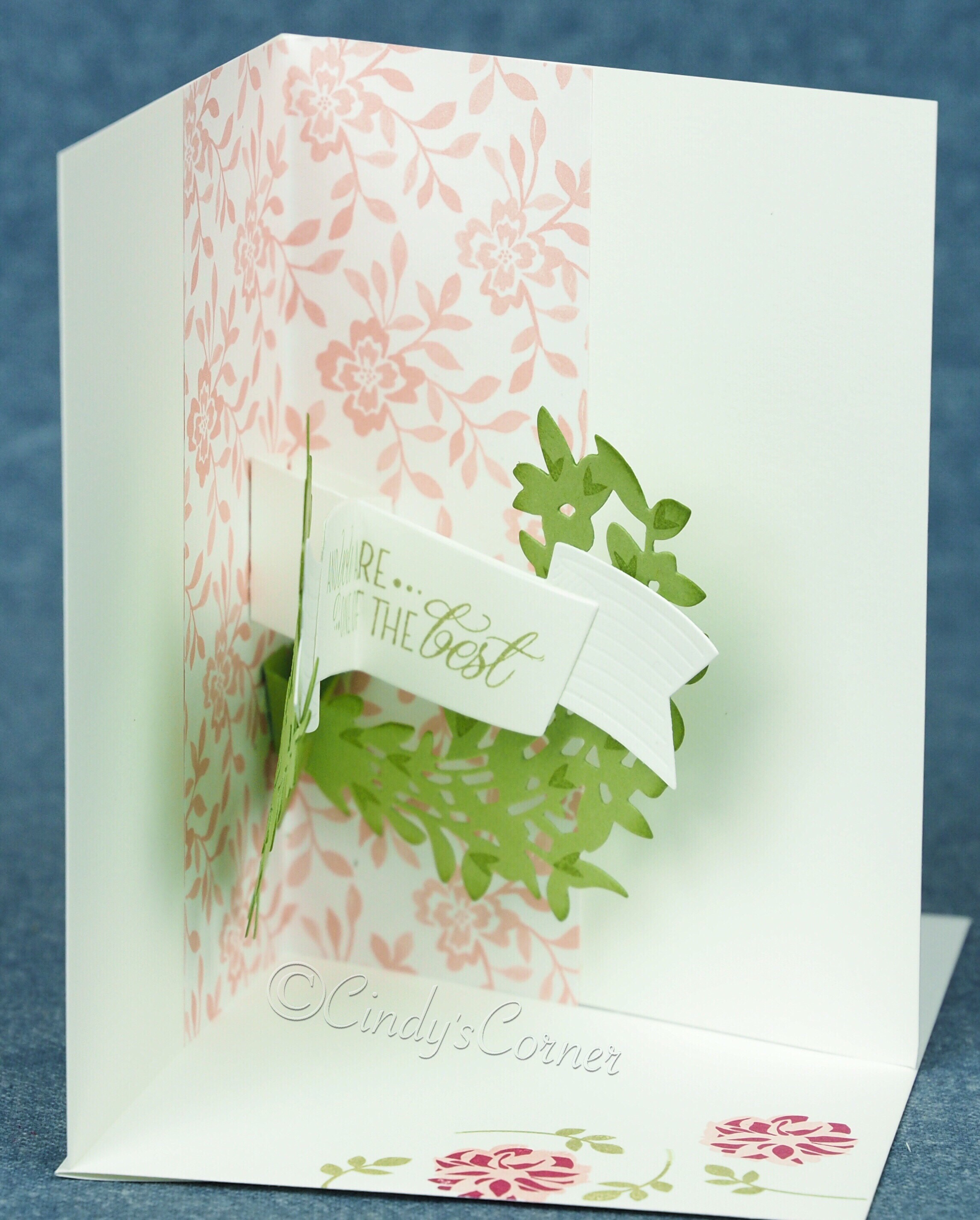 The card has a surprise when opened, with a pop-up laurel inside, made with the Lovely Laurel Thinlet dies which come part of a bundle with the Lovely Friends Stamp Set. (you save 10% when buying the bundle) While this looks to be a little difficult to assemble it is really easy because the dies give you the tabs to adhere it to the card – I recommend you use either mini glue dots or Tear and Tape to give a good strong bond.