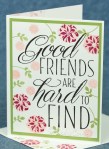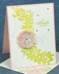 The laurel wreath, banner and flowers are all cut using the Lovely Laurel Thinlets, The stamp set is called ‘Lovely Friends’ which is perfect for my theme to day. The laurels were cut in Lemon Lime Twist card and adhered directly onto the Chocolate Chip layer, the banner and flowers were popped up on Stampin’ Dimensionals, a final flourish of pearls to finish off.