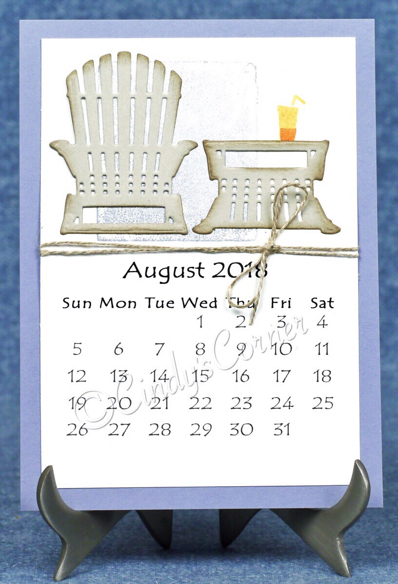 The Colorful Seasons Stamp Set and coordinating dies came out for August and September’s calendars. I stamped a clear D Block into the Wisteria Wonder ink pad, spritzed it with a little water before applying it to the Whisper White card, it kind of gave it a bit of a hazy bloom of a ‘skyline’ . The chair was cut from Sahara Sand card using the Seasonal Layers Thinlets then sponged with some Sahara Sand ink. I cut out 2 of the chairs, then cut off the ‘back’ of one of them, turned it upside down to create the table. My ‘Tequila Sunrise’ was stamped directly on the white card so it looked as though it is sitting on the table. A little linen thread wrapped around to complete the laid back look.