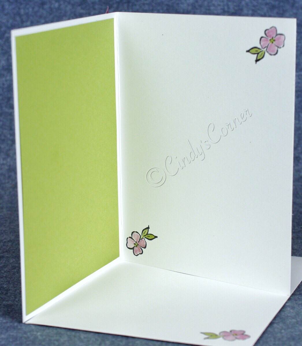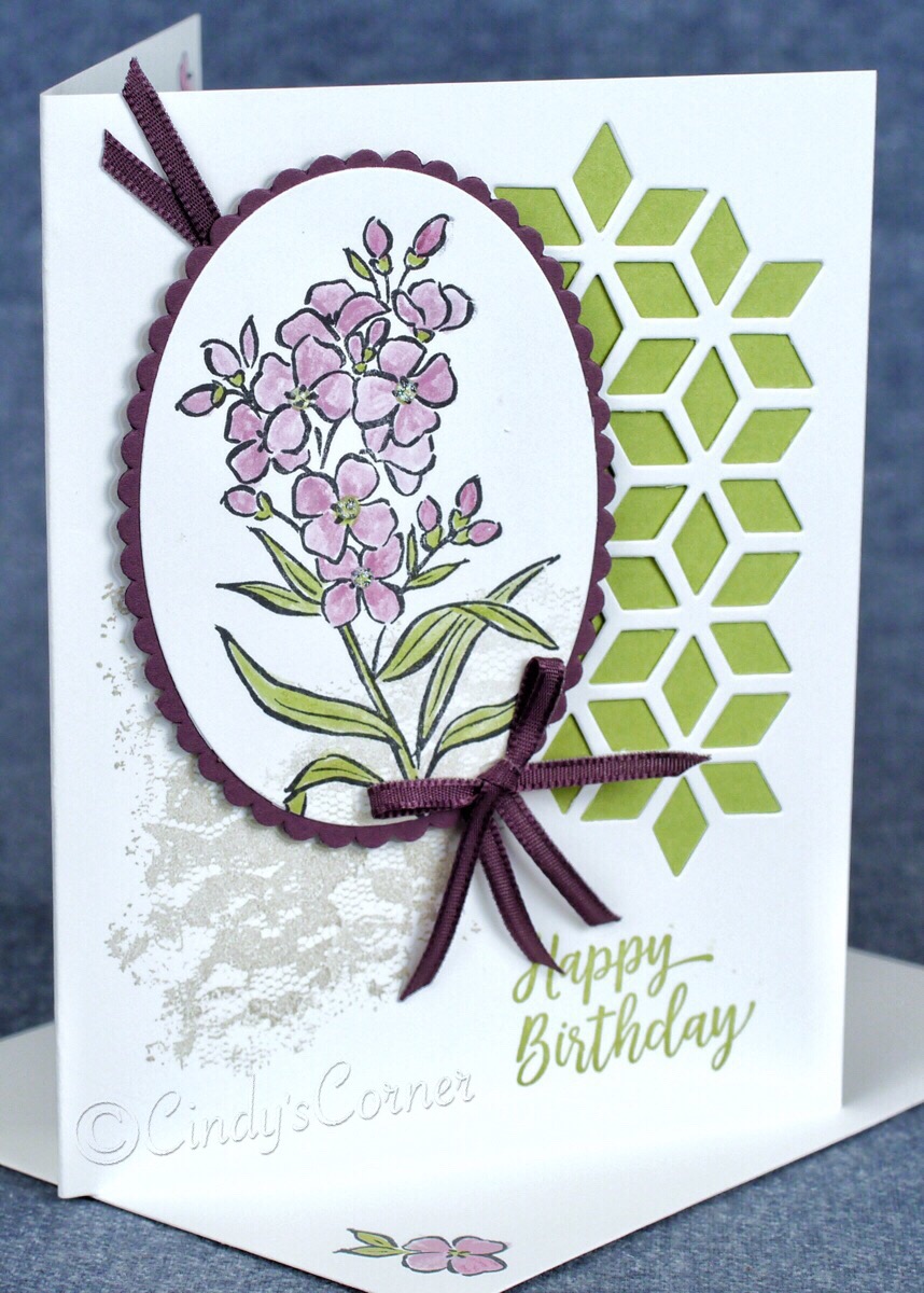 The flower is stamped in Archival Black ink and the lacy stamp placed on the bottom of the stems. The oval was cut with the second to largest plain oval and the Fresh Fig layer with the larges scalloped oval. The flower was colored using inks and a blender pen – very relaxing – I even colored the flowers on the inside of the card and on the envelope.