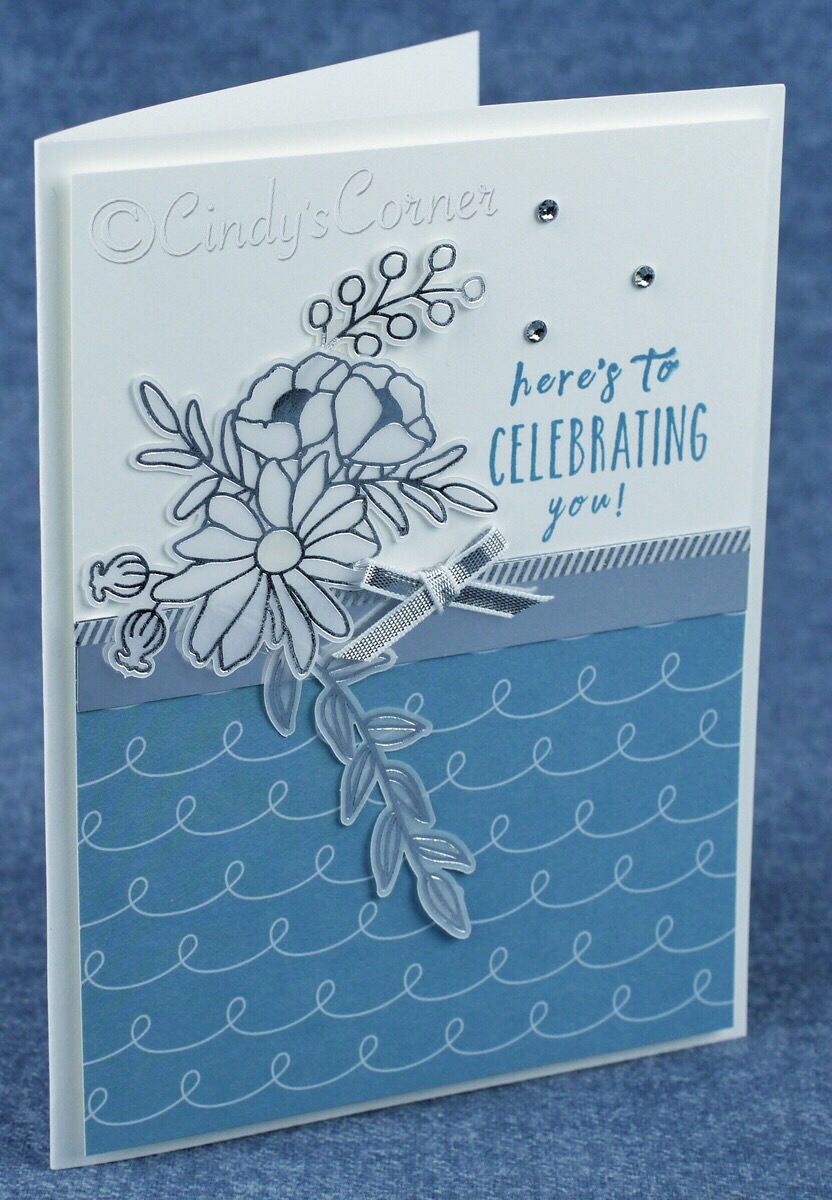 This card also serves as a fond farewell to the ‘soon-to-be-retiring Marina Mist ink and paper as well as the 1/8 silver ribbon.