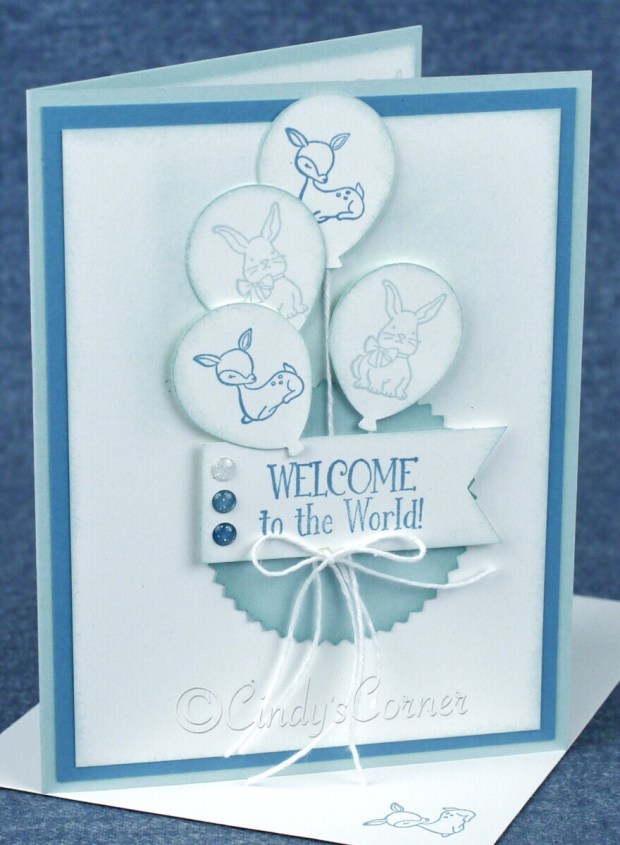 Ooppss………………. I did it again! A new baby arrived in the neighborhood and I STILL don’t have any new baby stamp sets! So once again I have improvised and found a couple of really cute images in the Good Day stamp set that fit the occasion perfectly….. and coupled with the Balloon Bouquet punch I feel happy with the result.